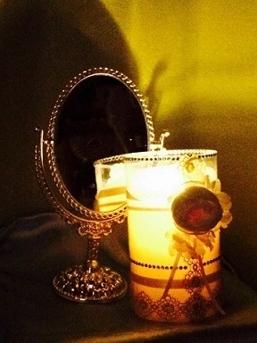サイズ感のあるキャンドルにリボンやラインストーンを飾り